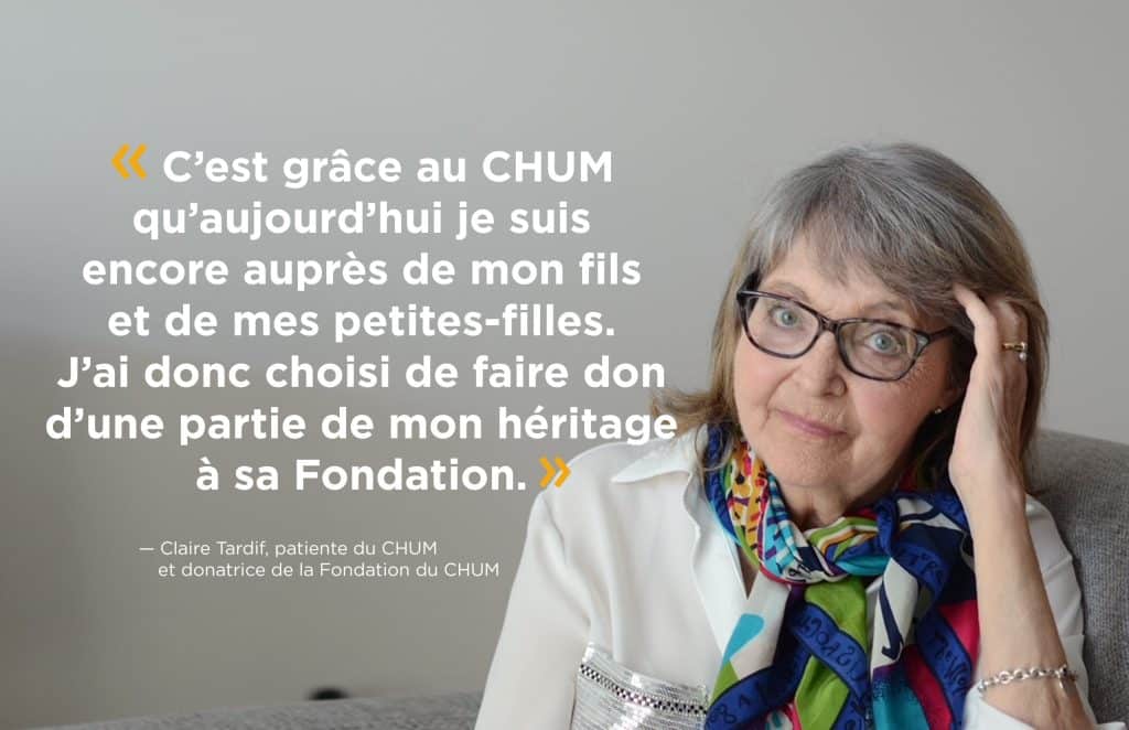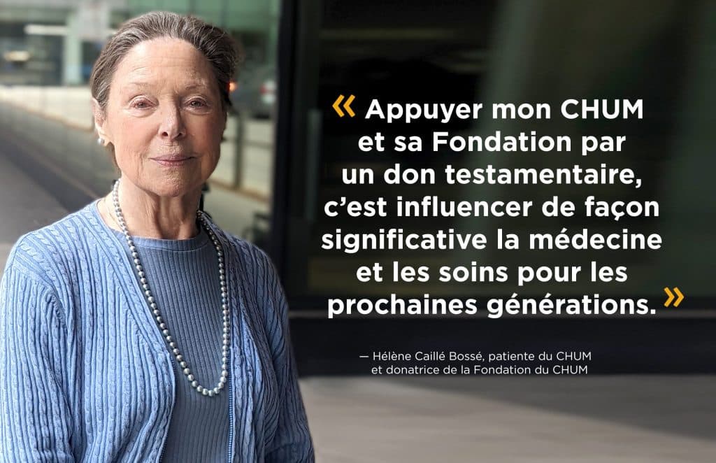 Saviez-vous que, dans votre testament, vous pouvez attribuer une somme d’argent à un organisme de bienfaisance enregistré comme la Fondation du CHUM? Vous en entendrez probablement parler de plus en plus dans les prochaines années puisqu’une étude de Volonté de faire a révélé une augmentation importante (de 5 % à 8 %) du nombre de personnes au pays qui font des dons testamentaires.
